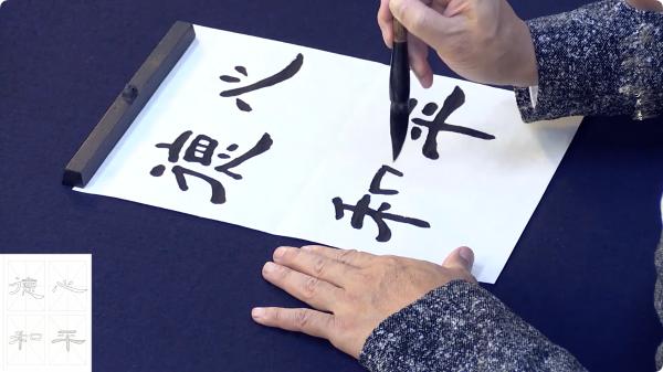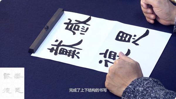 初步了解《曹全碑》以及艺术层面上的用笔、结字、章法的理论知识。教师用四字熟语示范点横竖等,解读它的用笔特点。接着,解读了《曹全碑》组成文字结构的要领,并用四字熟语来示范上下结构、左右结构等。然后,用大中小毛笔示范并解读《曹全碑》的章法学习,学习扇面、镜面、斗方、条幅的创作。最后,用大号和特大号笔来示范二八尺横批和四尺中堂。