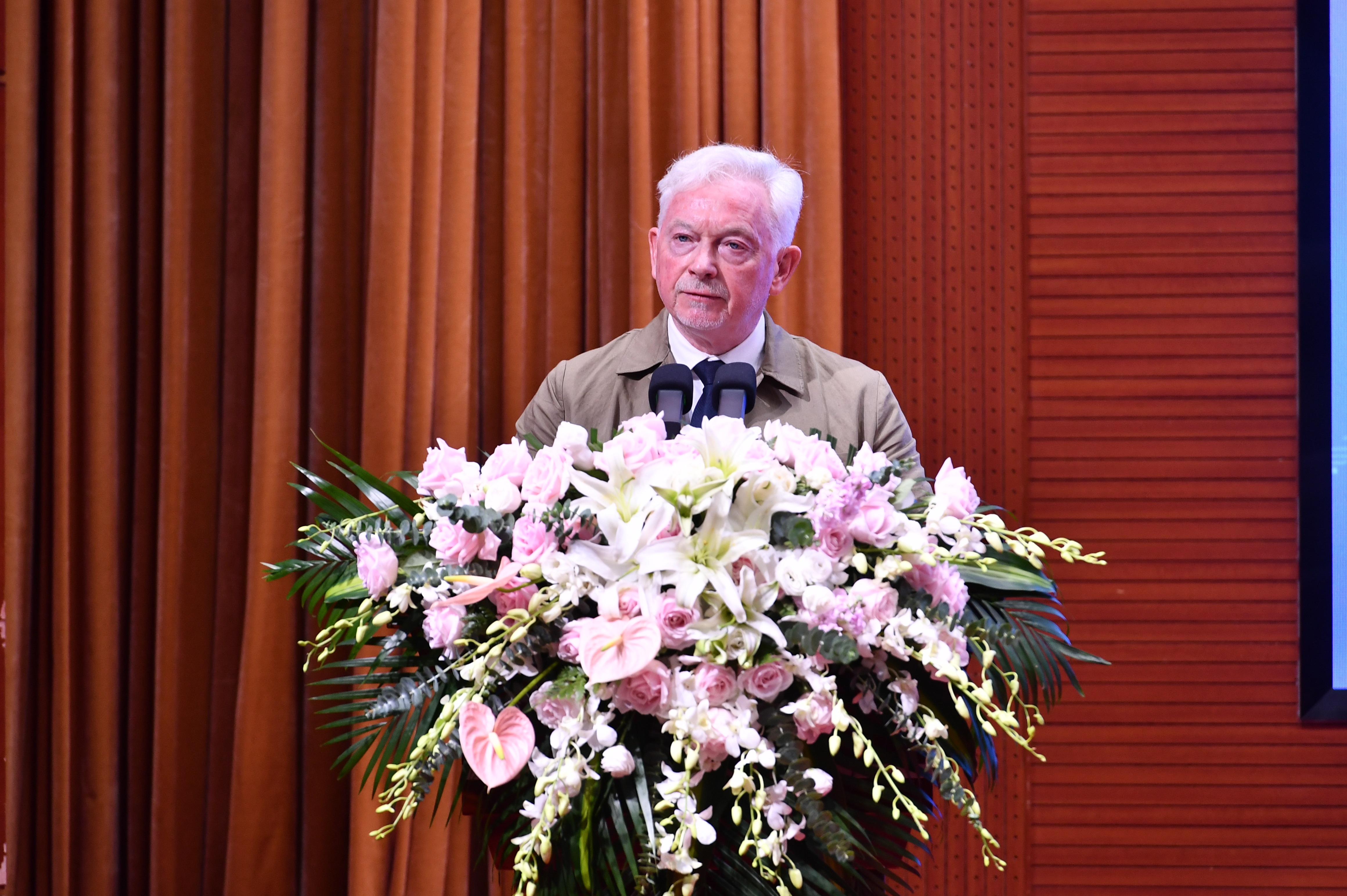 英国巴拉克明中学孔子课堂外方负责人、前副校长基思·詹姆斯代表孔子学院院长纪念奖章获得者发言,他分享了巴拉克明中学孔子课堂在数智教学方面的实践与成效,通过打造“随时随地可访问”的在线课程体系,持续优化数字化教学策略,孔子课堂的教学成果有了显著的提升。