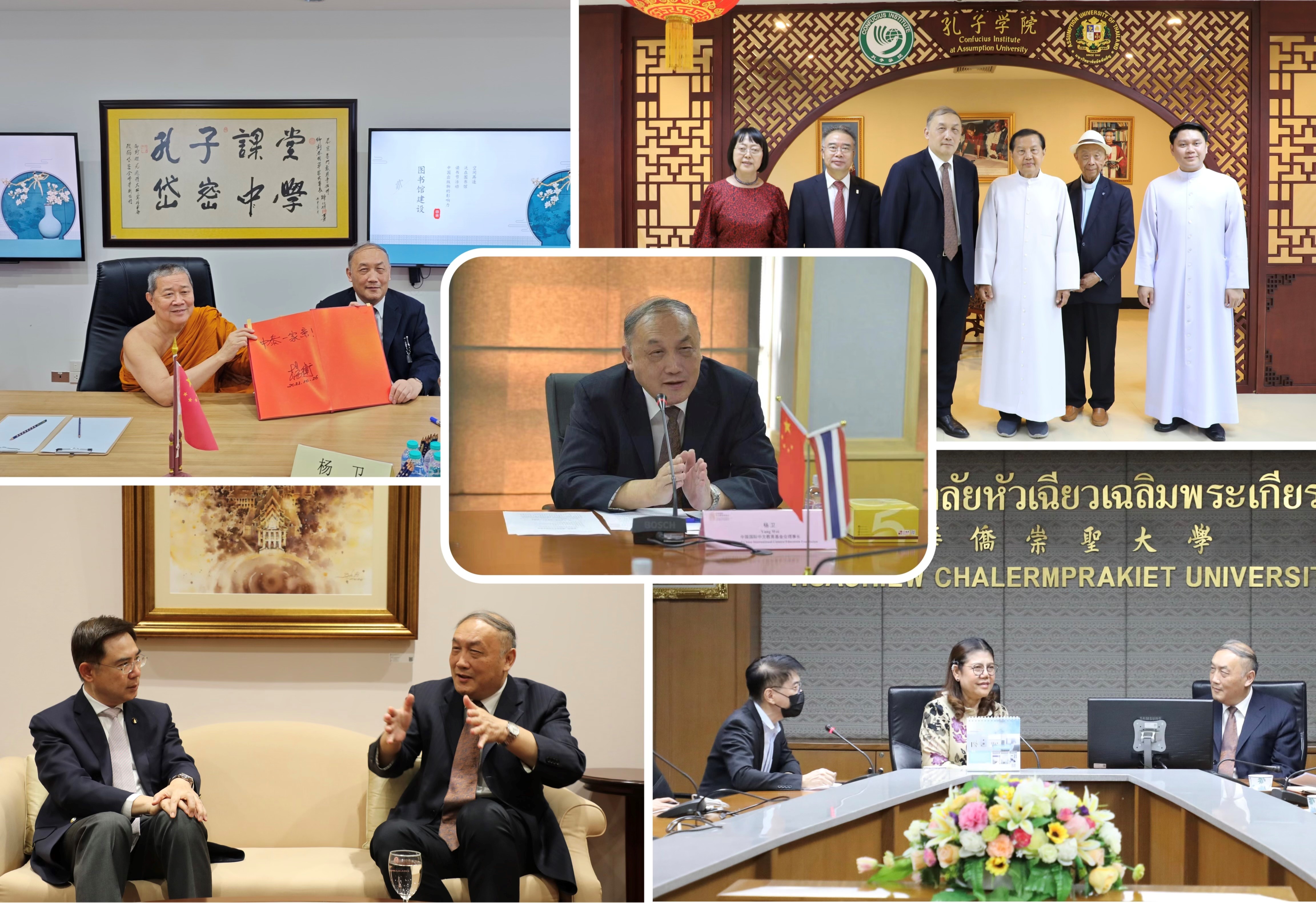 在泰国期间,杨卫理事长访问了5所孔子学院(课堂)的外方合作机构,深入了解相关机构和孔子学院(课堂)建设发展情况。海上丝路孔子学院理事会主席颂德通猜副僧王在泰国具有广泛的影响力,备受泰国社会各界尊敬,他在会见中介绍了设立全球第一所孔子课堂—岱密中学孔子课堂和倡导建立海上丝路孔子学院的经过,他推动中泰教育部门签署了多项合作协议,并表示将继续加强对在泰中文教育和中泰文化交流的支持,以促进“一带一路”倡议、泰国4.0经济发展战略和东部经济走廊战略的深度融合。博仁大学帕塔楠·派琛楚副校长指出,博仁大学正是通过海上丝路孔子学院积极参与到“一带一路”合作倡议中,多年的友好合作证明了无论在国际中文教育还是学术交流合作上,设立孔子学院是学校非常正确的选择。朱拉隆功大学班迪·厄阿鹏校长评价孔子学院的工作取得了卓越成效,为泰国的学习者提供了良好的中文学习平台,在助力中泰交流合作方面发挥了积极作用。华侨崇圣大学邬莱攀校长介绍该校合办的孔子学院以中医为特色,对当地中医专业人员培训和中医文化传播发挥重要作用。易三仓大学班查校长高度赞扬了孔子学院院长和教师们的辛勤工作,并亲自引领工作团参观孔子学院的教学场所。该校为孔子学院师生提供了良好的工作和生活条件。明满学校校务总经理郑双喜先生表示,明满学??鬃涌翁靡源ズ秃胙镏泄幕⑴嘌乱淮形娜瞬盼喝?,通过开展丰富多彩的教学文化活动,孔子课堂已将中文教育辐射至泰国东部地区,成为当地中文教育的知名品牌。杨卫理事长对各合作机构严谨、务实的合作办学态度表示赞赏,对各孔子学院(课堂)取得的成绩予以肯定。基金会将继续和各机构携手,为在泰国的孔子学院和课堂稳健、扎实发展提供支持,为促进中泰多领域合作贡献力量。